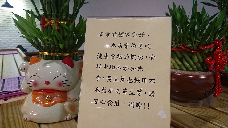 磁碗盤、木筷鐵湯匙、不加味精、不泡藥水的綠豆芽,主打健康概念,新開幕店內還非常整潔,老板很親切,裡面有好幾個老店員,不知道是不是萬華店來支援的。