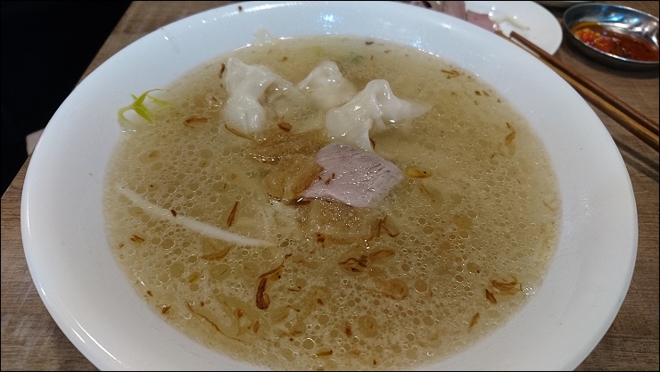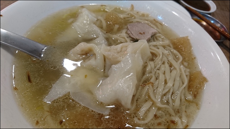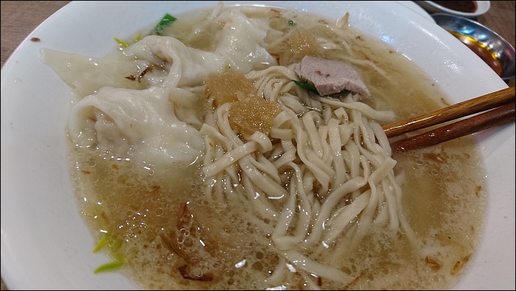餛飩麵上頭也有膨皮肉燥,大骨湯頭看起來很濃郁,喝起來倒是少鹽清爽,因為是不加味精的健康路線,重口味者也可以請店家調整。