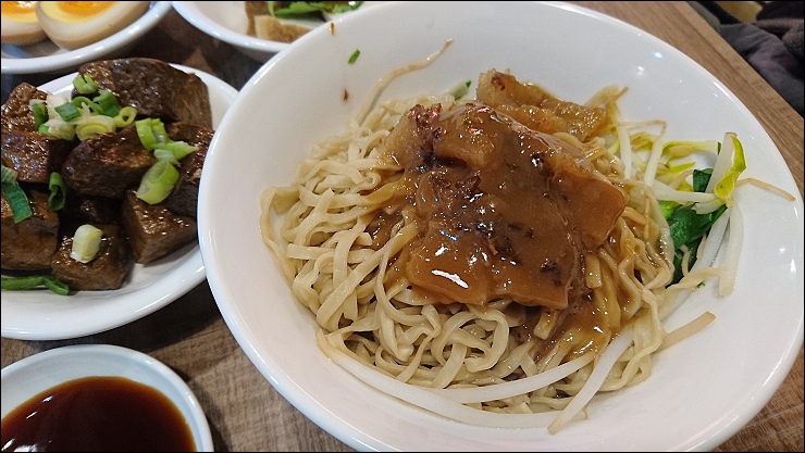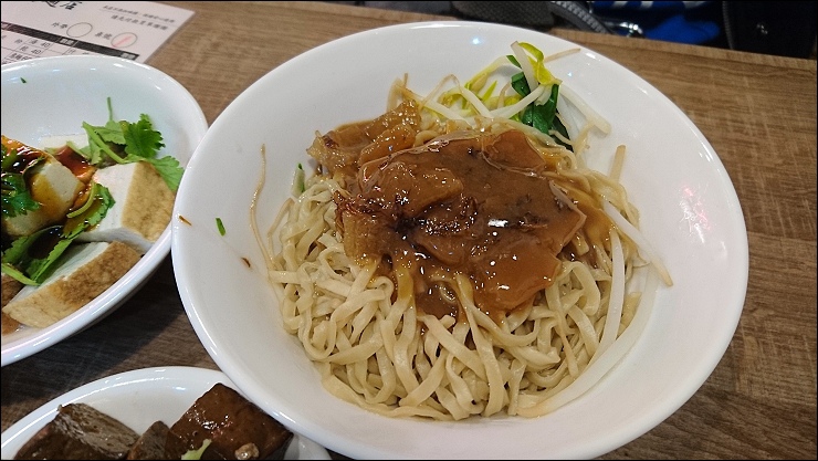 乾台南意麵,重點在於上面的膨皮,是店家自製的炸豬皮,加了這個膨皮肉燥感覺就很古早味,醬料蠻特別的,甄大嬸愛吃,鳥大叔覺得還ok,聽說在萬華本店還可以單點滷膨皮。