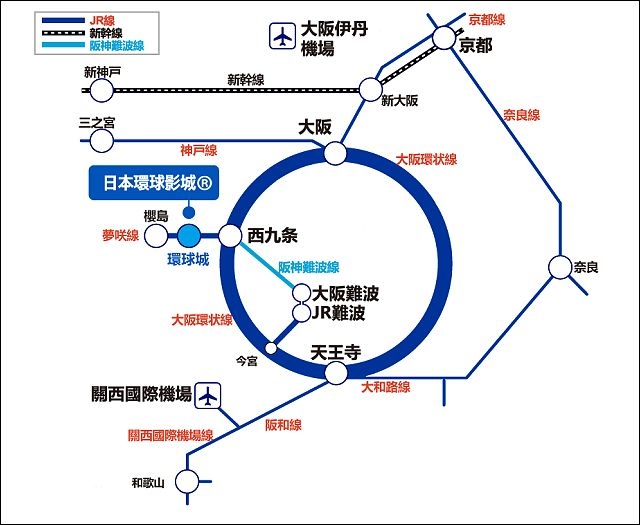 如果改搭電車或是從市區到日本環球影城,一般都是搭到西九条再轉JR櫻島線(夢咲線),或是JR環狀線可以直達(但在大阪JR線比較少利用到)。我們這次因為錯過巴士,只好搭乘南海電鐵到「新今宮」後,再出站到JR「新今宮」站,換乘大阪環狀線到「西九条」站,最後再跳上JR櫻島線前往目的地,總共換了2次車,又得嚕行李,相當不推薦XD(本圖取自日本環球影城官網)。
