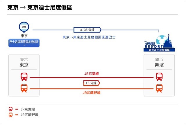 去東京迪士尼的交通還蠻方便的!像我們住在上野,先坐JR上野東京ライン到東京站再轉JR京葉線到舞浜,所需時間34分鐘,需換一次線,車資是302円。(※路線圖取自東京迪士尼度假區官網※)