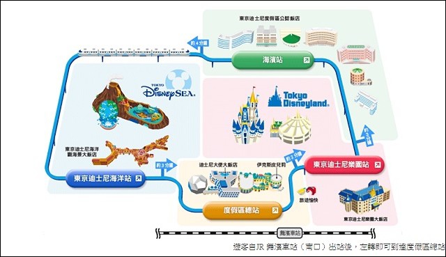 到了舞浜站還要轉乘通往度假區內各大設施的單軌電車,自JR舞濱車站(南口)出站後,左轉即可到達度假區總站,電車會先到迪士尼樂園,再來是海濱站,最後才是迪士尼海洋,然後我們一到王妃就尖叫,因為她看到想坐的達菲列車,去的時候我們趕時間殺進園區抽FP,回來答應她可以慢慢等。是說一堆人在排隊買迪士尼的期間限定車票,也有人會在看板這裡拍照留念,我跟王妃一心一念只想趁著一開園立馬進去,頭也不回的快速PASS。(※單軌電車路線圖取自東京迪士尼度假區官網※)