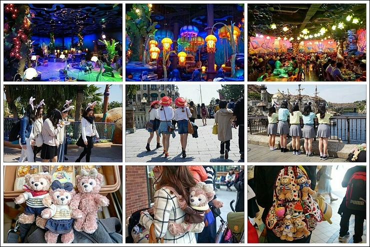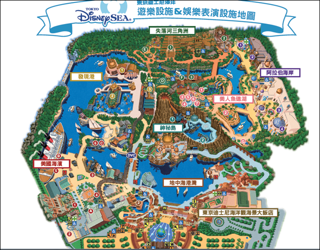 海洋迪士尼主要分成七個「主題海港」區域,切合主題的遊樂設施、表演節目和餐廳等。和迪士尼樂園最大的不同是,樂園內有銷售啤酒、葡萄酒等酒精性飲料,鎖定大朋友的心和胃!所以有人說這裡是比較適合年輕人與大朋友來的,因為遊樂設施也相對比較刺激一點,像朋友就不小心帶著還是大班的女兒坐上驚魂古塔,女兒直接嚇哭XD