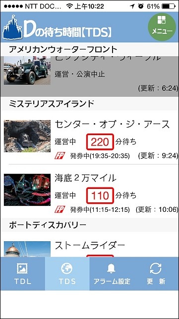 這個APP一定要下載,超方便的!可以明確知道目前各個遊樂設施需排隊幾分鐘,就連FP發到那個時段可以玩,都一清二楚!才中午不到,地心探險的FP已經要抽到晚上七點半才能玩XD,偷偷告訴大家,海底兩萬哩不用浪費時間去排,有點無聊:P