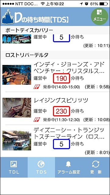 最下面的那排選項,TDL就是迪士尼樂園,TDS是迪士尼海洋,點TDS後會顯示每個區域的遊樂設施目前營運狀況,有此一說,要排60分鐘算是幸運、60-90分鐘算是正常、120分鐘也不為過,但我們真的老了,我跟王妃排了15分鐘的印第安納瓊斯就決定放棄...而且在經過環球影城飛天翼龍的訓練過後,驚魂古塔對我而言真的很OK了!哈哈,可惜當天沒辦法再挑戰印第安納瓊斯及忿怒雙神,媽呀!我真的變大膽了‼