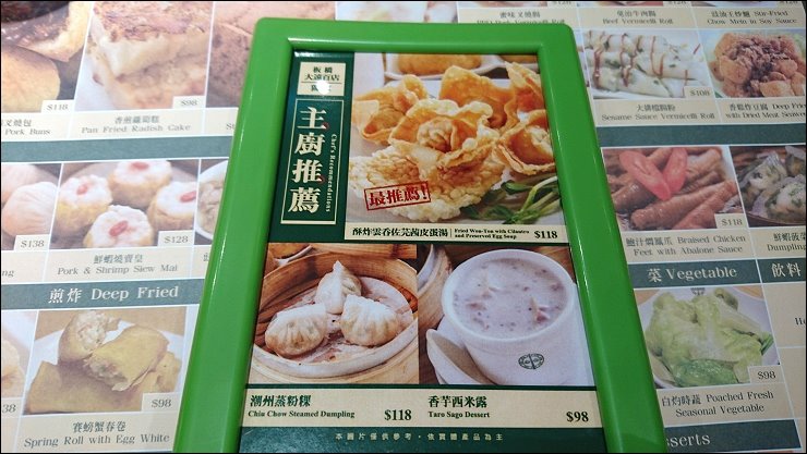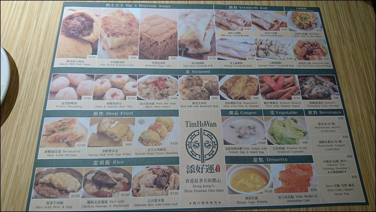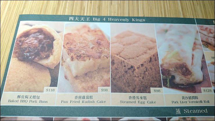 餐墊紙即圖片菜單,最上頭是添好運的四大天王,酥皮焗叉燒包、香煎蘿蔔糕、香滑馬來糕和黃沙豬潤腸。