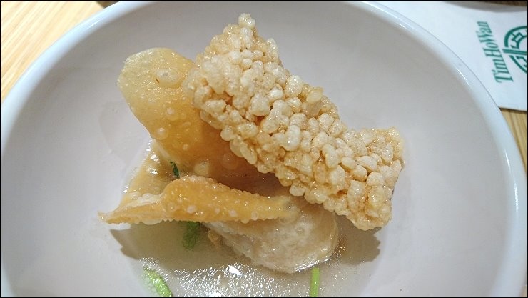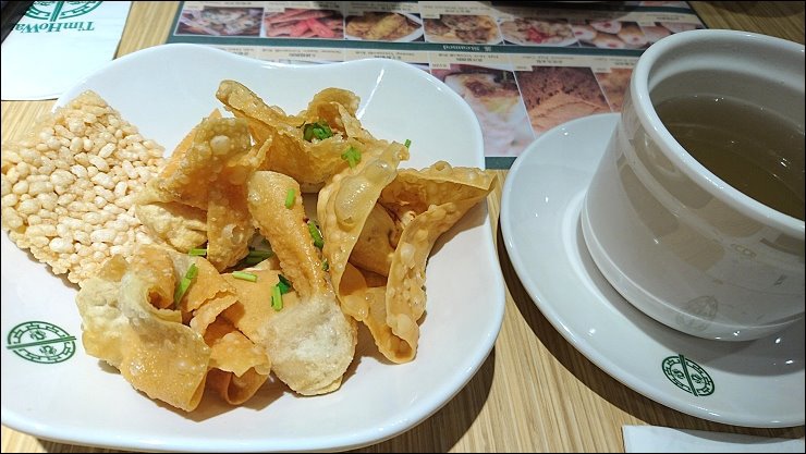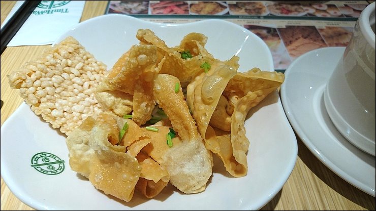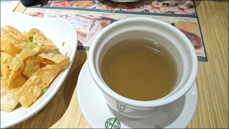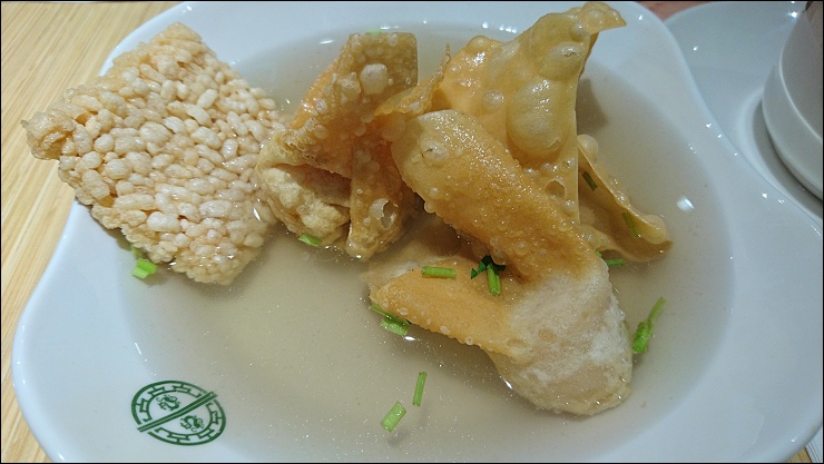 板橋店限定的酥炸雲吞佐芫茜皮蛋湯,酥炸餛飩和香菜皮蛋湯分開上,酥炸雲吞可以單吃也可以泡湯吃。