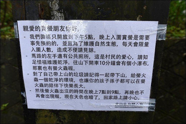 大山北月的正常營業時間只到17:00,如果是預約大山北月的螢光晚餐,活動時間是17:30入園,18:00準時用餐,19:10賞螢,20:00前結束,後面的步道沒有開放,賞螢是在前方草皮和後方生態池簡單導覽。![]()