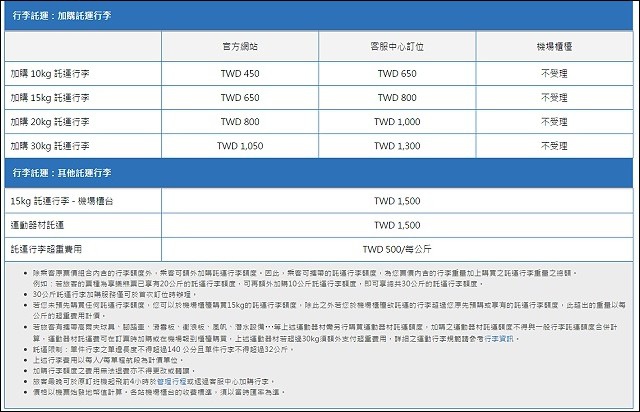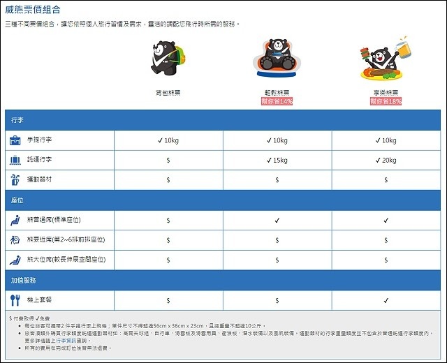 因為只有四天四夜的時間,簡單帶個26吋就很夠用了!威航提供三種不同票價,像是最輕裝極簡的背包客,有手提行李10公斤的額度,輕鬆熊票除了基本的手提,還有15公斤的託運行李,享樂熊票則是託運增加到20公斤,愛買一族的王妃很怕回程20kg不夠她用,硬是加買了10kg的託運行李費(450元),不過她這樣做是對的!因為事先加購價跟到了現場再被收超重費差很大!!(※後面兩張圖表取自威航官網※)