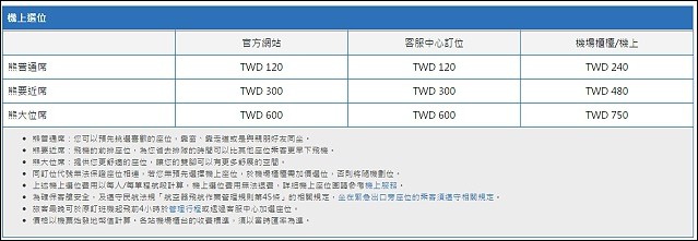 整個機艙感覺色彩很繽紛,原來第一排紅色的叫熊大位席,空間最大最舒適,要加價600元,之後前幾排的藍色是熊要近席,坐這可以提早下機,加價300元,白色的則是一般普通席,如果要選位則須加價120元,不特別選位就不用喔。(※最後一張圖表取自威航官網※)