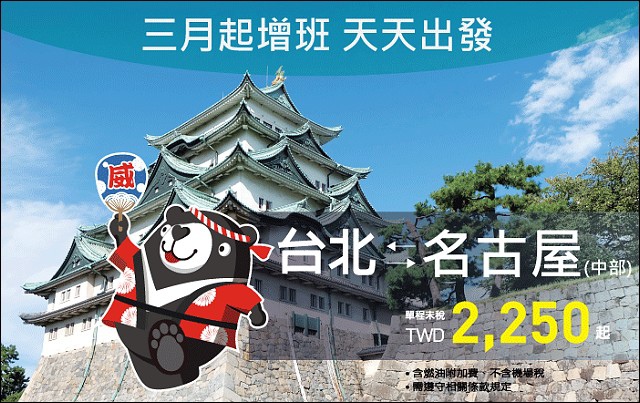 飛名古屋天天出發,可以延伸去黑部立山、合掌村、高山、金澤、三重及靜岡等,本次威航初體驗個人是覺得舒服又有趣!沒有想像中的擠或小,加價的餐點也不錯吃,空服員很有活力,座艙長的廣播好聽流暢又不死板,為一開始及最後的旅途都增加了不少快樂與記憶點!然後大明星威熊真的很有魅力!看到熊編走到了那裡都帶著小威熊一起,連我們攻上雪壁也有他!害我也興起想找一個代表自己的小東西~~(※第一張圖取自威航官網※)