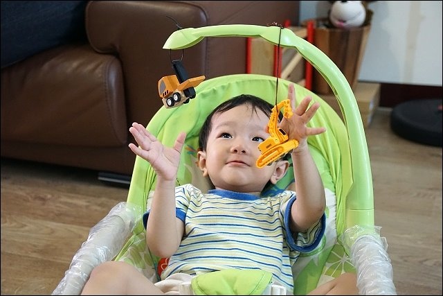 上面有掛可拆式的小物,寶寶醒著可以玩這個,不過我家阿弟太活潑好動,上面二個可愛的小獅子跟小花,被他挫下來不知在哪裡流浪了,媽媽我手太巧,DIY掛上他近期喜歡的車子。