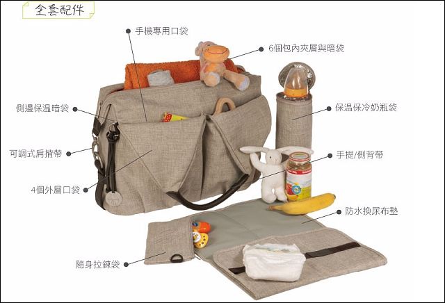 附很多配件,有隨身拉鍊袋丶保溫保冷奶瓶袋丶防水尿布墊,包包的夾層跟空間超大,包包可手提或調整成肩揹模式,出門一包搞定!(圖片來源:官網賣場)