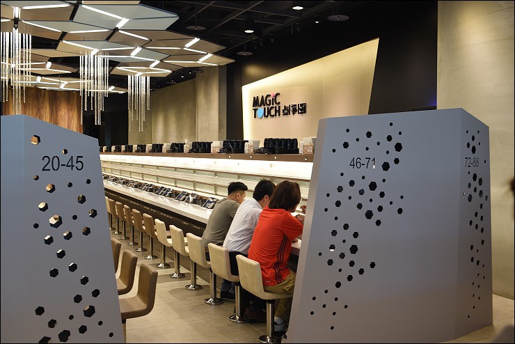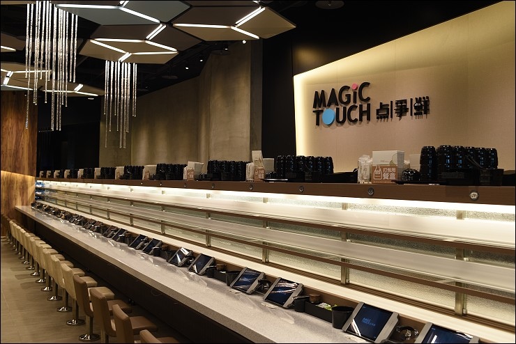 高鐵南港站即將於7月通車,跟台北車站、新北板橋車站和高雄左營車站都變成三鐵共構的超大站,百貨賣場美食選擇也愈來愈多,其中這間新開的Magic Touch點爭鮮南港店,原本只有台茂和竹北二間分店,南港店是台北第一間分店,主打iPad自助點餐和雙層新幹線列車送餐,6月底試營運人潮就不少,小朋友來的重點應該都是玩多於吃。