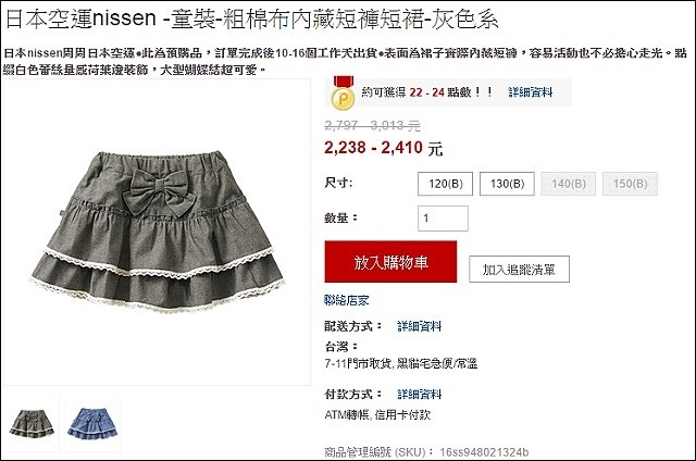 這組棉100%針織褲裙2件組是我跟妹妹一起看上的!標準的nissen設計,有點點跟素色,深淺各一。淺藍色這件彷彿是荷葉邊裙子,但實為好活動的短褲,隨便搭件卡通T就很青春活潑!