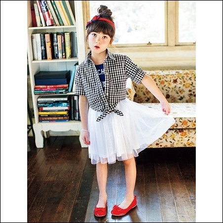 這件雖然有小女孩最愛的澎澎紗裙,但不會太公主假掰,上面配的又是簡單的灰短T,不致太花俏女人,我喜歡這種清新又帶點小甜甜的風格。這件SIZE為120~150CM,適合幼稚園大班生到小學生這個階段,打四折後是2,842*0.4=1,136元,最大號是3,015*0.4=1,206元,紗裙質感很好喔~~