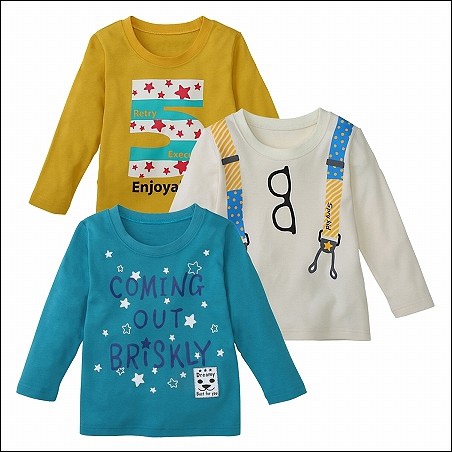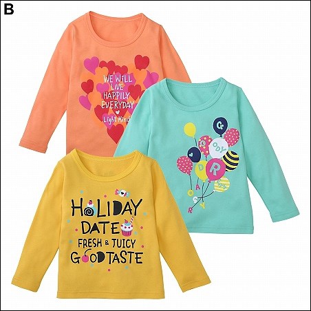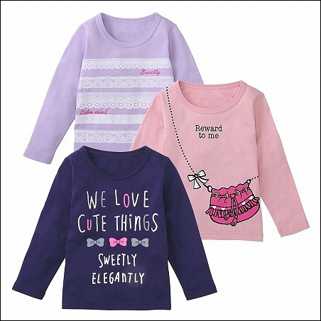 這組女孩長袖印花T恤3件組,三款都很實搭,顏色花樣都可愛!庫存件數只剩兩選一,直接幫你省略一款,免得傷腦筋,哈!這種薄上衣很實穿,秋天當外衣單穿,冬天可以穿在裡面當內衣喔。三件687元,一件229元。