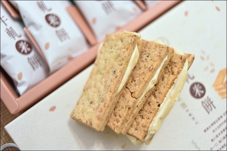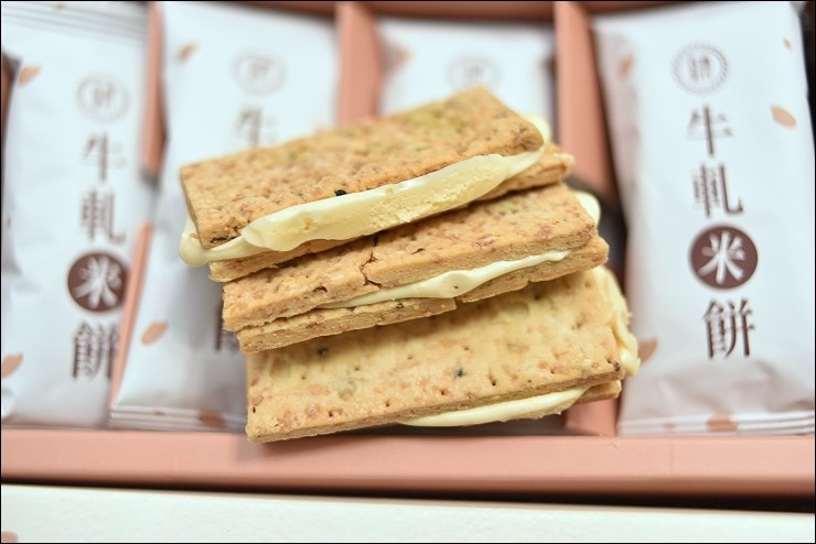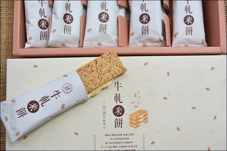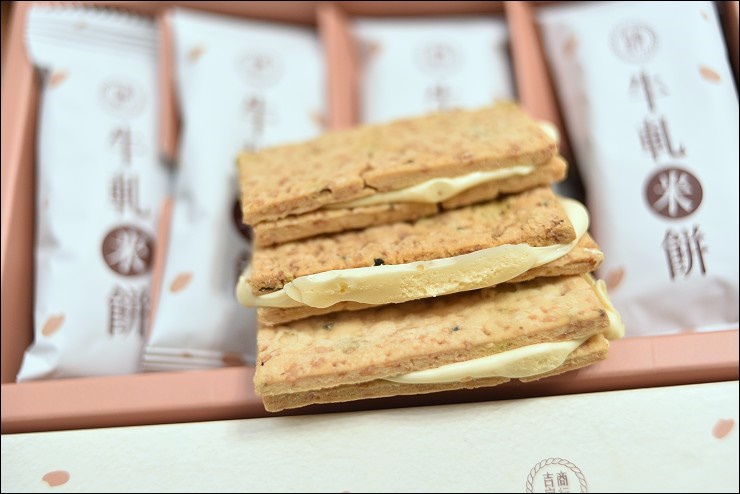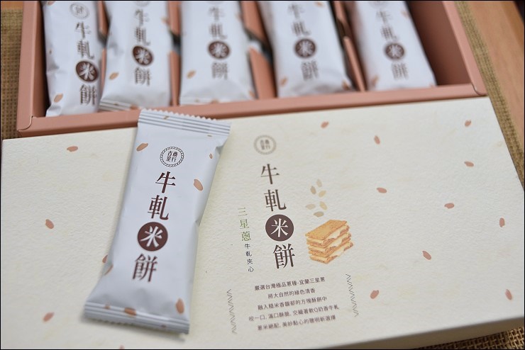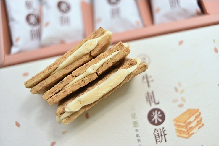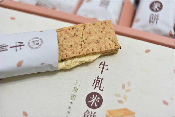 牛軋糖夾心幾乎每片都是爆漿狀態,方塊酥餅皮除了加入三星蔥之外,還有宜蘭五結的糙米,口味酥香不油。