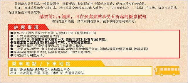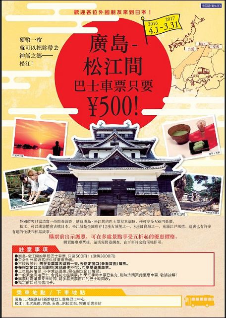 寫文的時候查資料才發現!!廣島電鐵・日本交通・日ノ丸自動車・一畑バス四家巴士業者攜手合作,推出『廣島~~山陰高速巴士外國人優惠』,只要出示外國人護照,就能以優惠價格搭乘高速巴士前往山陰地區,優惠期間從2016年04月01日~2017年03月31日止,等於原價日幣3900的『廣島~~松江 高速巴士』,竟然最後單程只要¥500,等於打到快一折欸!這個優惠連日本人都不知道欸!!販售點在廣島巴士中心三樓(廣島SOGO 3F)/ 廣島車站新幹線口二樓Swallow Travel,以及松江一畑 松江駅前営業所(JR松江車站前)。