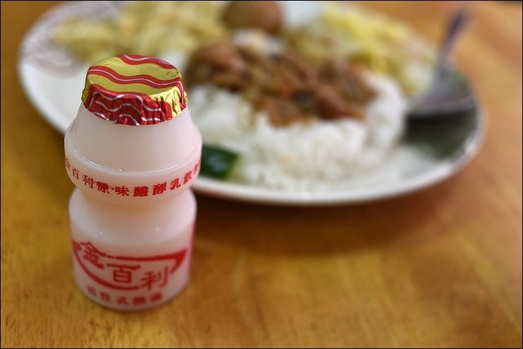 魯肉便當附白菜滷、筍絲和魯蛋,再加贈一瓶金百利多多,小小一瓶騙小孩很好用。