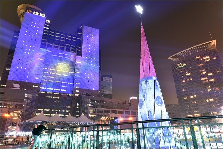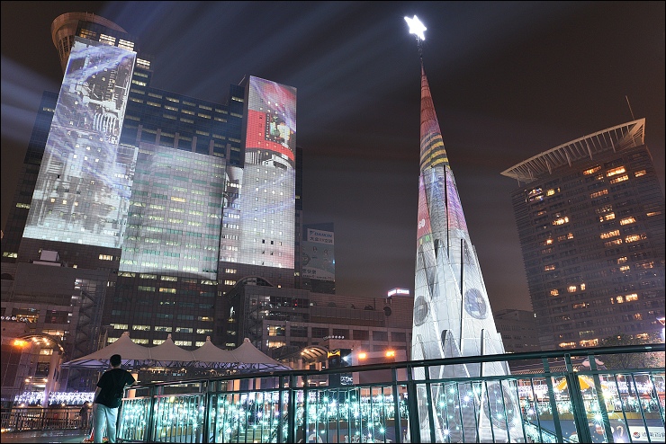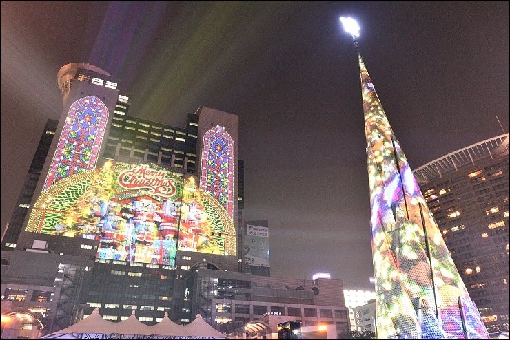 看完浪漫的LED燈藍海,走上階梯就是全球唯一的360度3D立體光雕投影耶誕樹!!