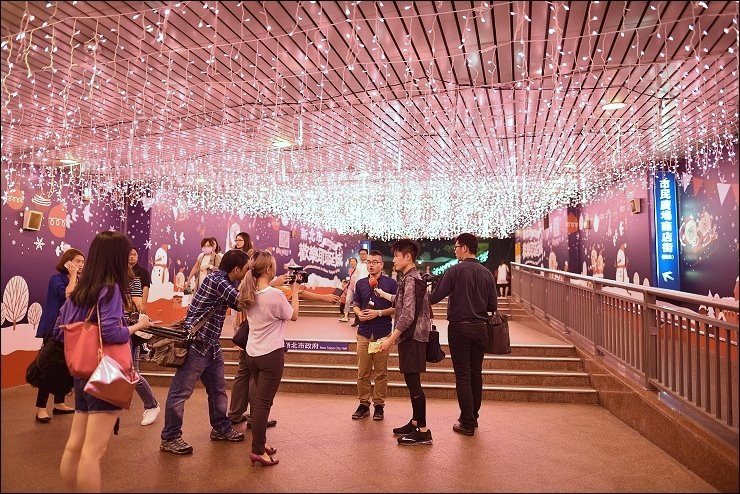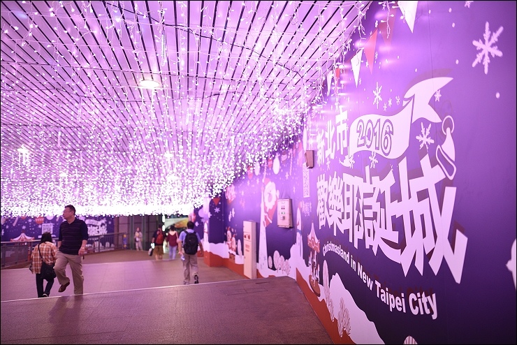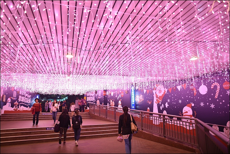 搭捷運台鐵或高鐵來的話,出板橋站從B1地下通道往新北市政府方向走,快要到達3D立體光雕投影耶誕樹的出口階梯前,就有一片LED紫色燈海,從這裡應該就會開始忍不住拿起手機拍照FB打卡~~