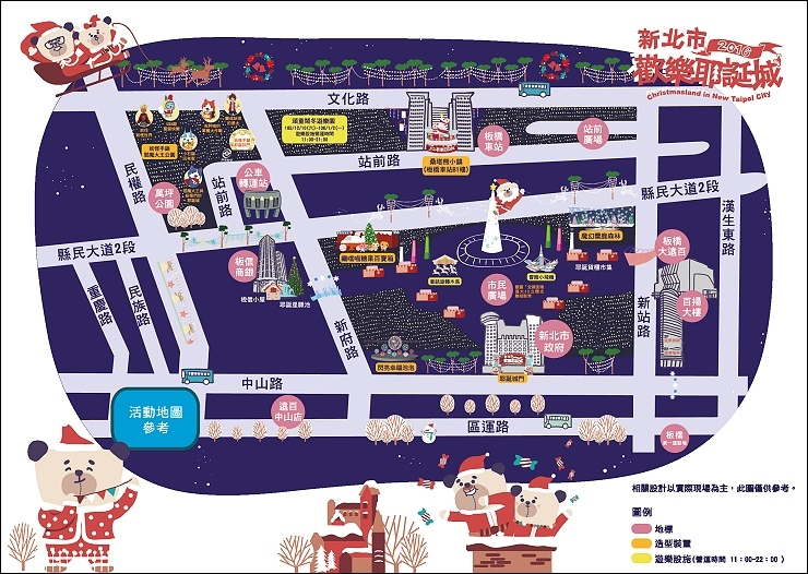 先來列出必看亮點燈區、賞燈路線和活動地圖參考,除了全國面積最大的新北市政府3D光雕投影秀之外,必看亮點還有萬坪公園的妖怪手錶和北歐風貨櫃耶誕市集,因為佔地廣大,基本上如果全家大小想要全部燈區走透透,小朋友應該會一整個累到,大家可以對照活動地圖,挑有興趣的自行增減。
