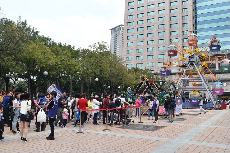 今年的重頭戲~號稱5樓高的摩天輪,現場看很顯眼,但是沒有覺得特別高,旁邊有個電動泡泡機,來的時候剛好碰到即將消毒時間,有些單槍匹馬的爸媽,感覺上是派人手先卡位。