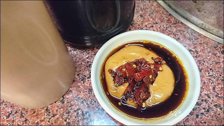 沾醬有豆乳醬和辣椒醬油,薑母鴨的標準配備。