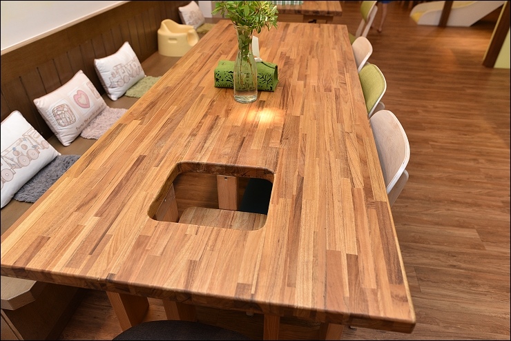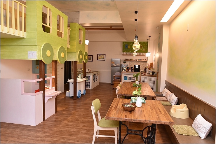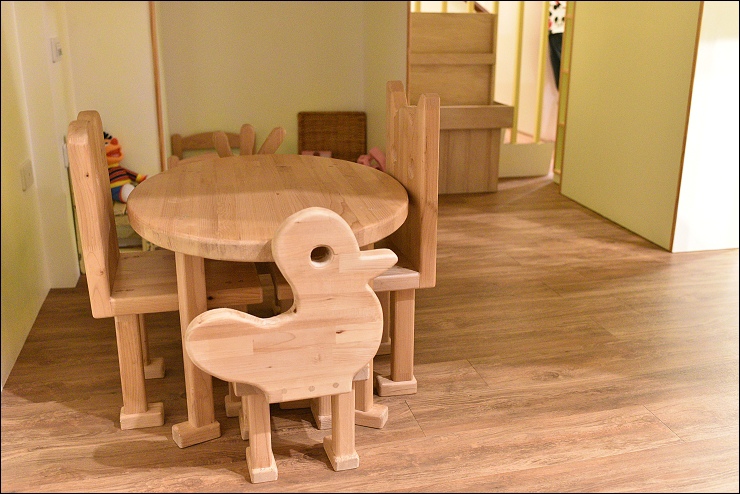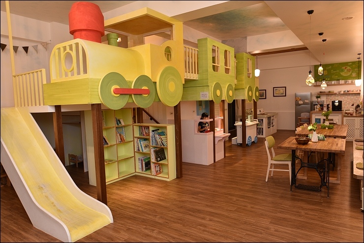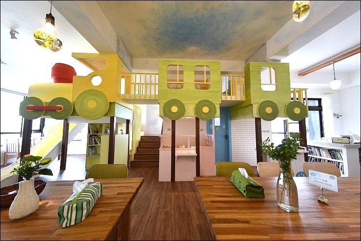 Checkin稍事休息後,小朋友可以先在大廳看看書、溜滑梯和伴家家酒,大家就近坐在旁邊下午茶,閒聊討論接下來的行程,長桌中間這個洞是特別設計給小小孩坐的,方便大人照顧。