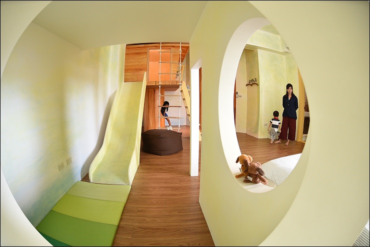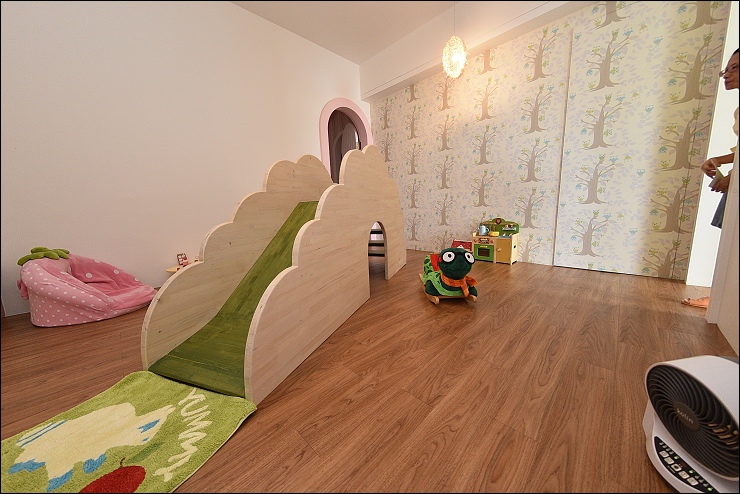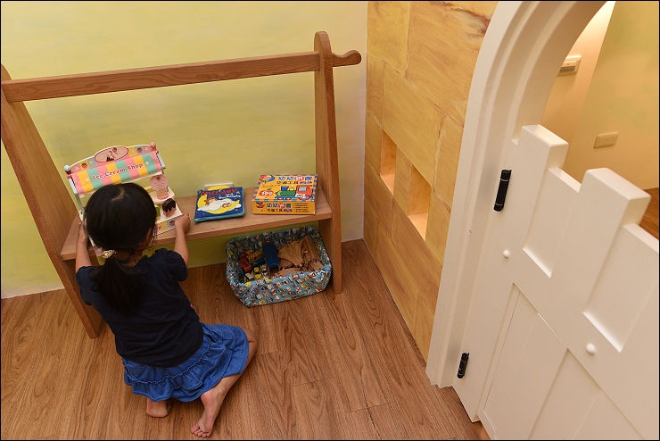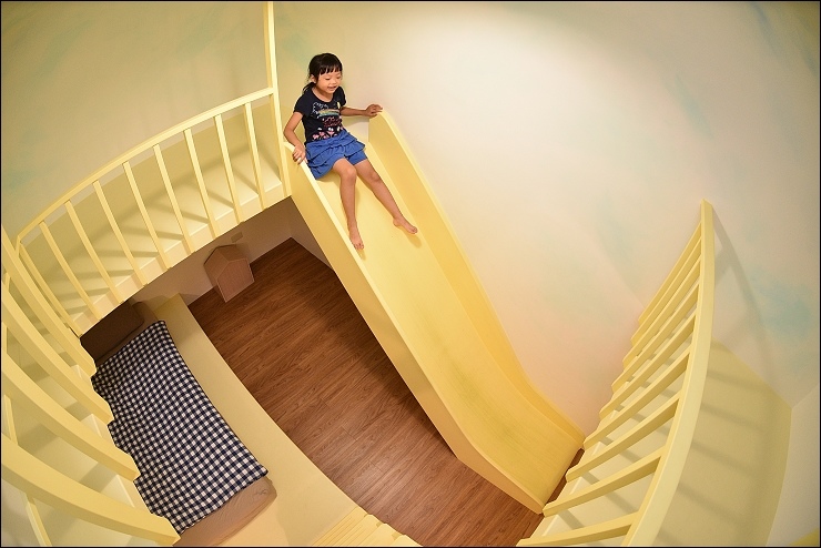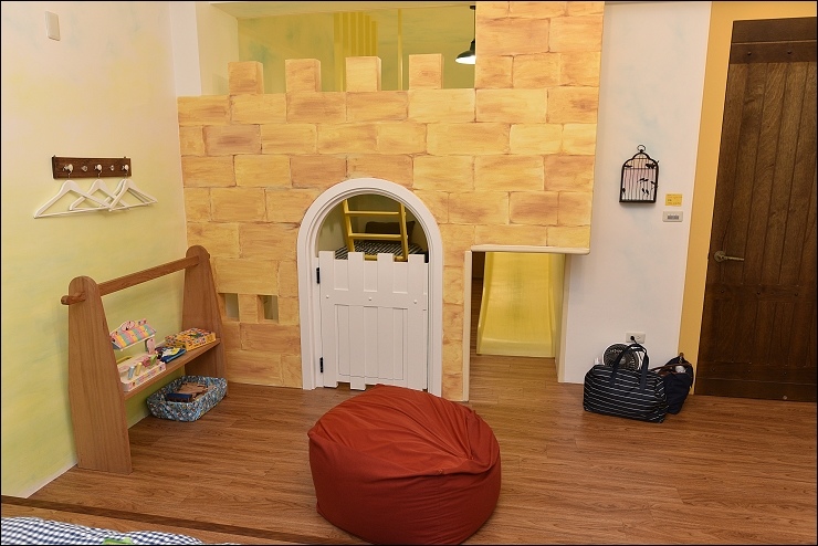 城堡房的特色就是有個大空間的城堡秘密基地隔間,裡面藏了個閣樓溜滑梯,孩子可以上城堡視察,視察後直接溜下來。