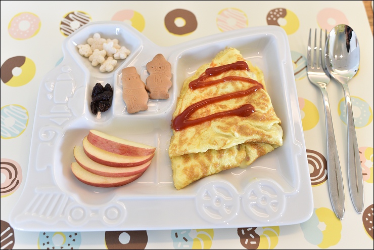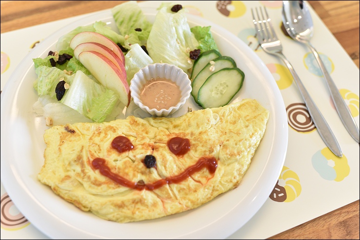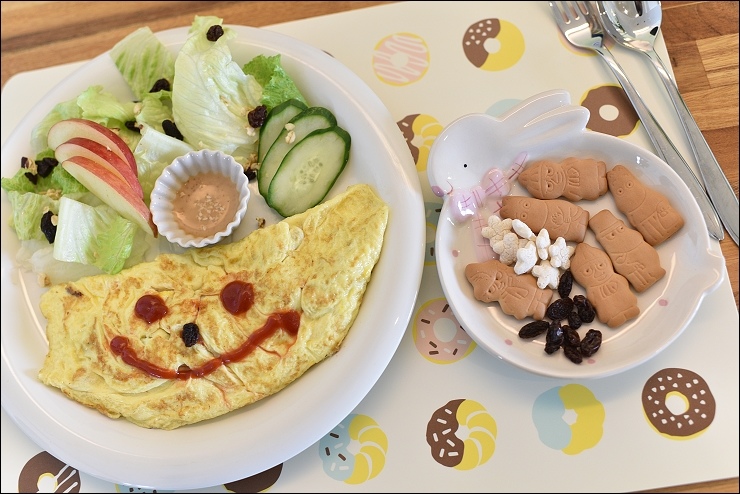 暖食早餐有歐姆蛋和蔬果沙拉,配個咖啡或熱茶,就是簡單好吃的早餐!餐盤上的北陸嚕嚕米造型牛奶餅乾,允嘉大哥和野馬妹超愛~~