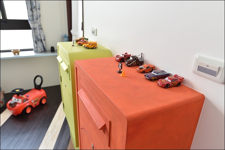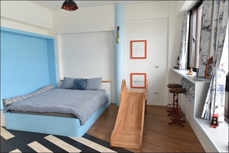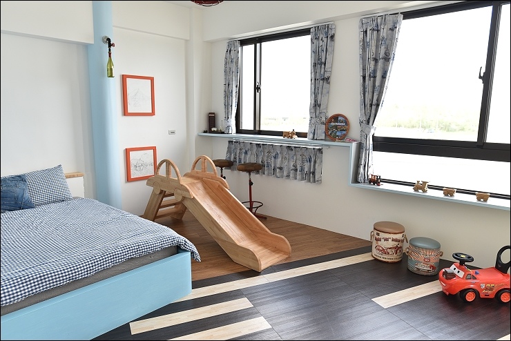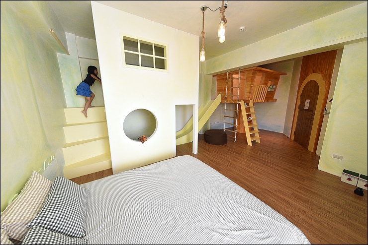 除了旅行的氛圍,這裡還加了小男孩最愛的閃電麥坤元素,還有每間房必備溜滑梯。