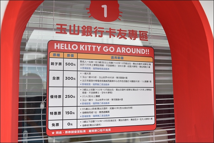 門票含一張遊戲券票價如上,3歲以下兒童免票,3歲以上兒童或學生優待票250元,全票300元,親子票500元,玉山銀行卡友有打折。