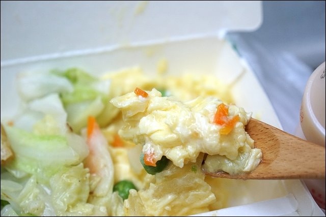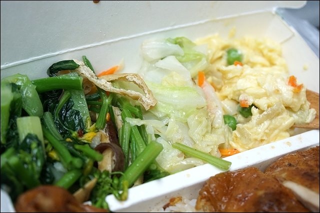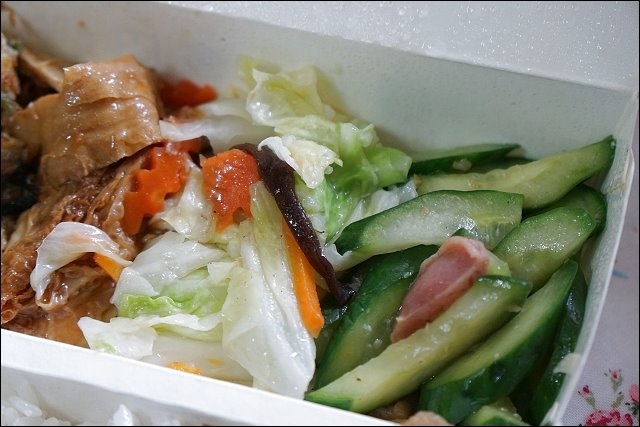 配菜可選四樣,小黃瓜、高麗菜都還保有脆度,九層塔煎蛋還滿香的,菜不會很油,配飯不知不覺就吃完了。