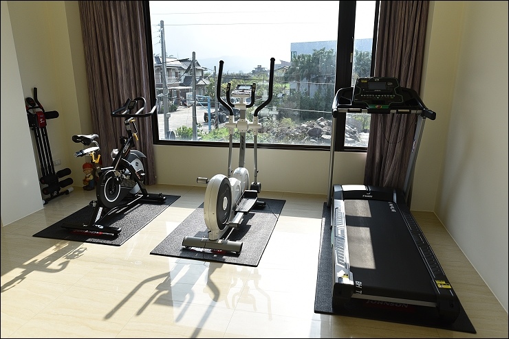 二樓梯間有跑步機、滑步機和飛輪,很少看到民宿提供這類健身房設備,應該跟設定的客群有關。
