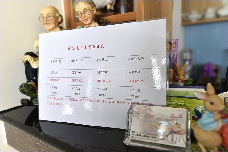 蘭庭民宿就只有豪華四人房、景觀四人房、豪華雙人房和景觀雙人房四個房型(二間有大浴室浴池/二間沒有訂房時請注意),房價不分平假日均一價,每房贈送2客頂級海陸大餐(平日晚餐加贈紅酒一瓶),如果四人房的小朋友還小的話,其實可以share吃。