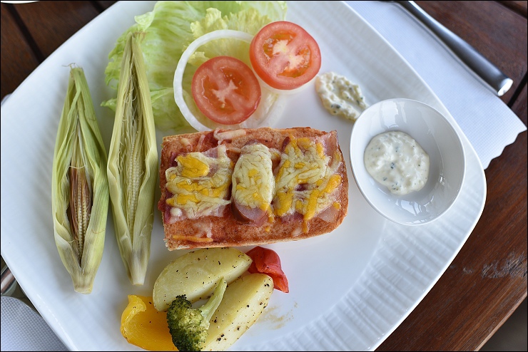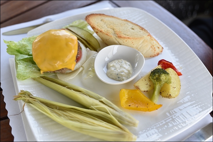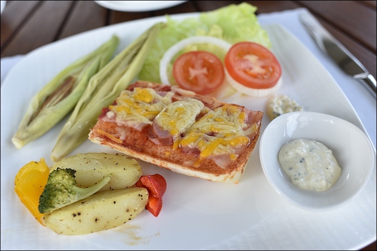 相較於一泊二食的高檔食材晚餐,蘭庭民宿的早餐走簡單清爽路線,漢堡排烤麵包搭配簡單蔬果,允嘉大哥覺得這間的一泊二食晚餐和早餐都超好吃的!