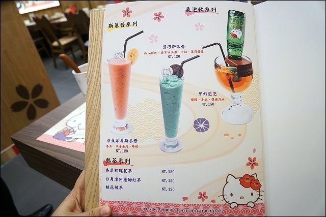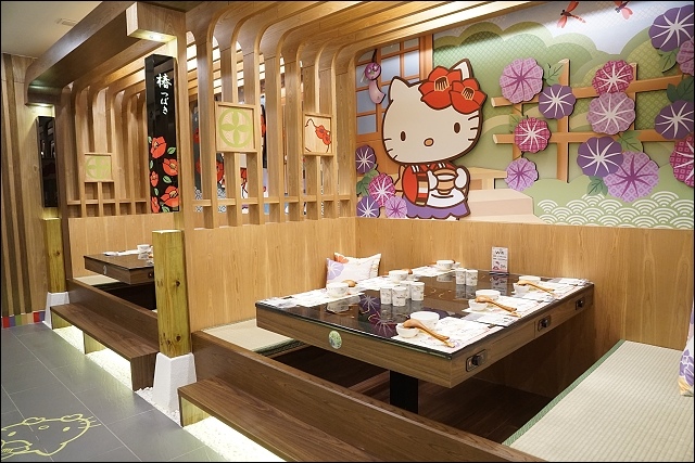 最裡面是有隱私的包廂和室座位,我個人最喜歡這區,地面有HELLO KITTY燈光投影,超有氣氛的,小朋友在踏踏米上也很安全,與好友要說心事聊是非也很自在,四個包廂分別以春夏秋冬設計不同的季節花款,預約時保留包廂位,動作要快。
