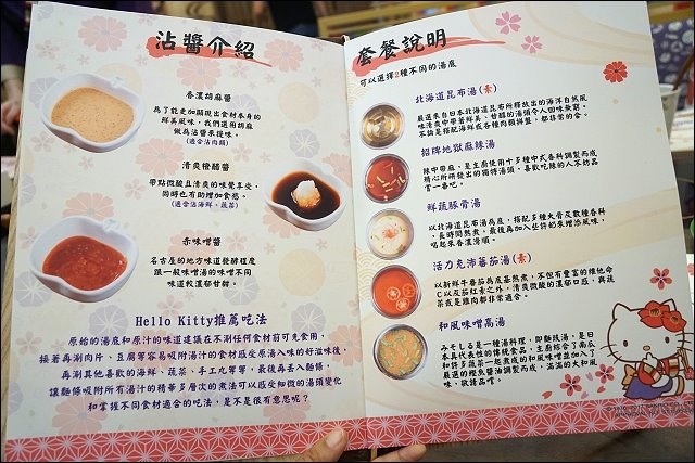 菜單設計很有質感,每一頁都有HELLO KITTY的身影,沾醬三選一,湯頭有五種,點套餐可以吃鴛鴦鍋吃二種湯頭,店家很推薦活力流充沛蕃茄湯,但我個人偏愛清爽的昆布湯,但它真的味道超級淡,若是重口味的朋友,可以點招牌地獄麻辣或和風味噌高湯。