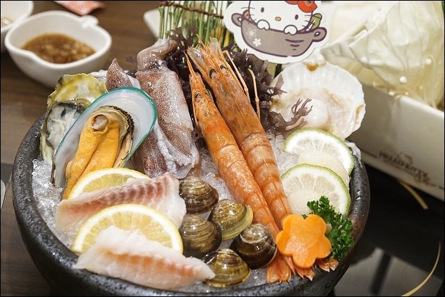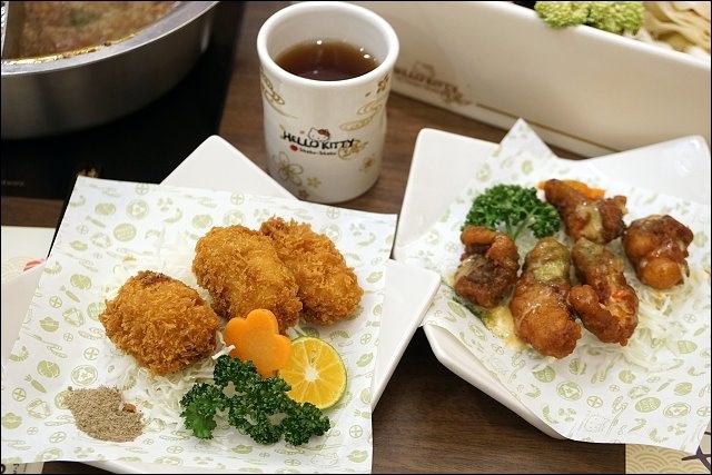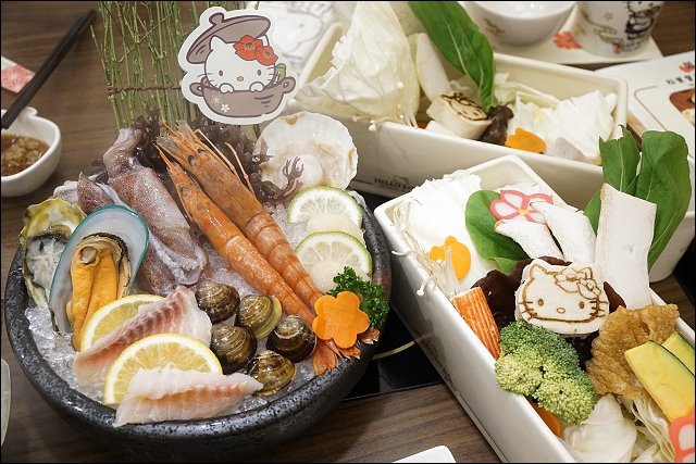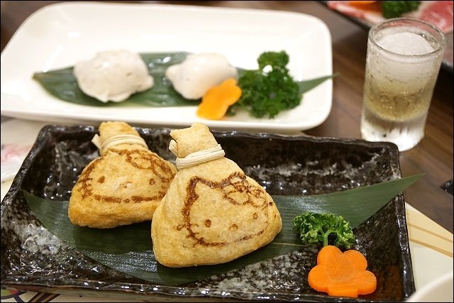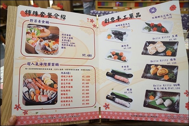 另有特殊套餐,不愛吃肉或吃素的朋友可以點野菜素食鍋,若是像我一樣海陸通吃的,可以考慮超人氣海陸餐,海鮮綜合盤+肉品9選1。也有手工單點菜色可以加點,HELLO KITTY豆腐菜盤就有附了,我加點了福袋,超可愛的!