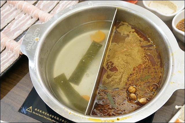 湯頭有五種,我選了適合阿弟的超清淡昆布湯,還有反差很大的大人版地獄麻辣鍋,麻辣鍋有麻有辣。