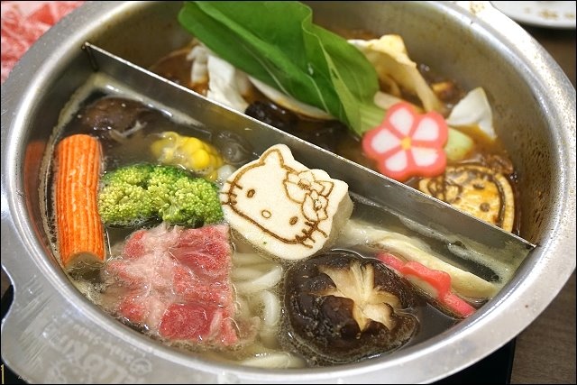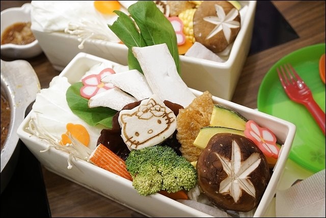 菜盤種類不少,南瓜、芋頭、花椰菜、金針菇、豆皮、青江菜等等,造型可愛的HELLO KITTY百葉豆腐很吸睛、香菇超大朵,舖底的是高麗菜。