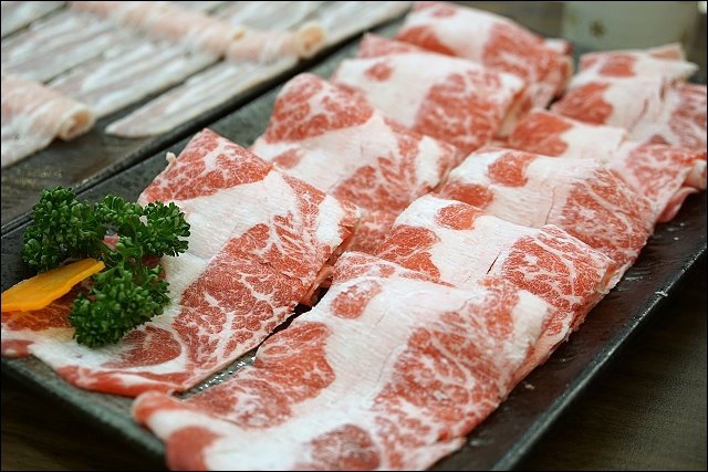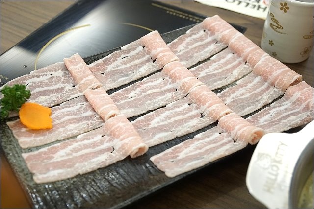 松阪豬,沒有豬腥味,口感Q又脆,白湯煮一煮加胡麻醬好香哦!放辣鍋煮不沾醬也很有味道。