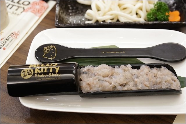 單點HELLO KITTY福袋,一顆份量不小,外皮是豆腐皮,帶點碳香味,裡頭是花枝漿跟蝦仁漿,我有吃到花枝塊。