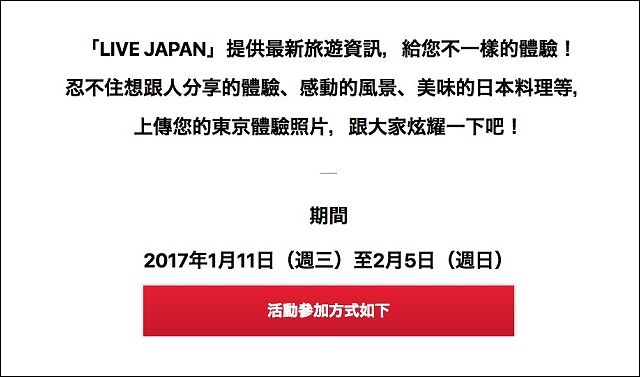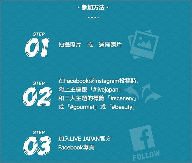 在Facebook的LIVE JAPAN頁面,先按「讚」後,再於Instagram或Facebook標註所指定的#標籤,接著只要投稿以下的任何一個主題的照片即完成報名。