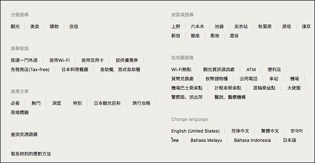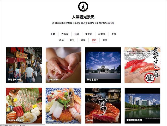 這個東京地圖畫的蠻好的,有助於大家稍微瞭解東京的地理位置,每個景點都是可以點擊的,點進去後就切換成該景點的專屬頁面,再細分成觀光、美食、購物、住宿等,有助於尋找更精確的目標。