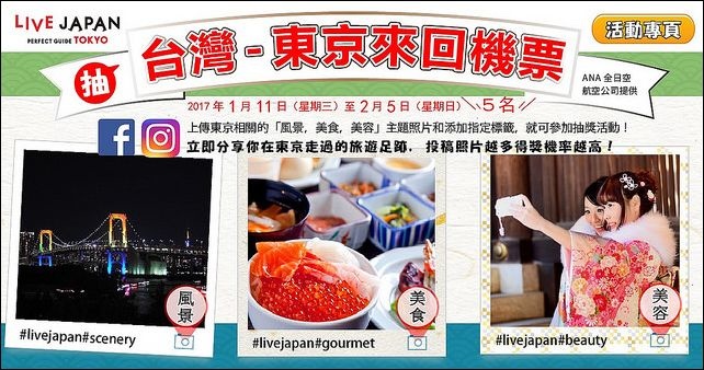 最後當然是好康到相報的時間到了!現在於LIVE JAPAN上傳「風景,美食,美容」的照片,就有機會得到「ANA」航空提供東京來回機票喔,活動時間為2017年1月11日(三)至2月5日(日),參加對象:只要是喜歡東京的朋友皆可。