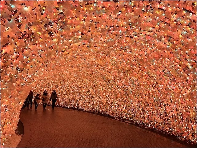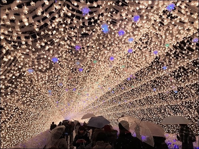 這次名古屋的首要重點行程就是名花之里的冬季點燈,但早場我們在長島的麵包超人館跟outlet就已經體力耗盡,尤其天氣好冷,阿弟都縮在推車上一直睡,醒著就吵著要回家,原本計畫四點多離開outlet,轉往名花之里看五點多的點燈,但偏偏這天風雪超級大,我只好心痛帶著阿弟坐巴士直接回飯店,友人雖然疲累但還是決定孤身前往探險,我回到飯店之後,友人直接視訊通話分享,能同步欣賞這片美景。