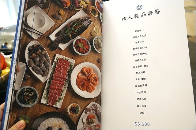看到這樣的菜色價格是不是很高?!四人套餐完整菜單在這裡,只要$3,680(加一成服務費),同行友人都覺得不貴,海鮮份量都很夠,鮮蝦就一大盤,整大隻石斑魚跟透抽等,而且我們覺得可以六個人來點四人套餐,再加點其他菜就行,很讚!